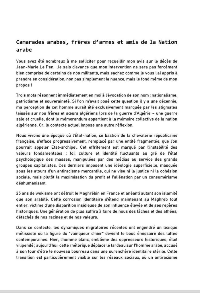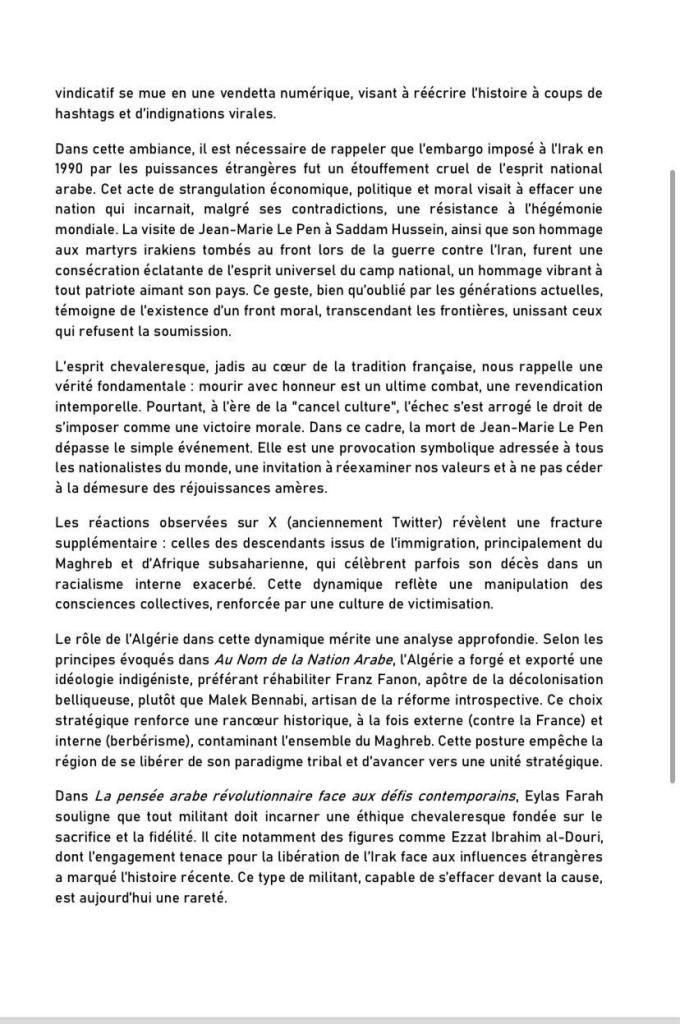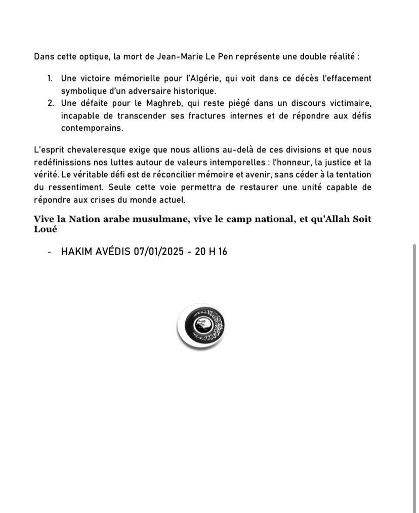 L’un de mes camarades intellectuels, Hakim Avedis, président des Panarabes francophones et écrivain, avec qui nous menons, chacun de son côté, des combats politiques, certes avec nos divergences communes et nos trajectoires divergentes, mais avec un but ultime qui est la souveraineté des peuples, m’a envoyé le communiqué officiel de sa structure concernant la disparition de Jean-Marie Le Pen.