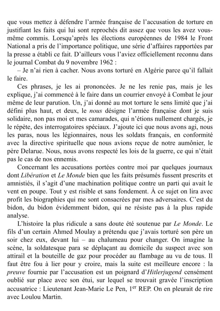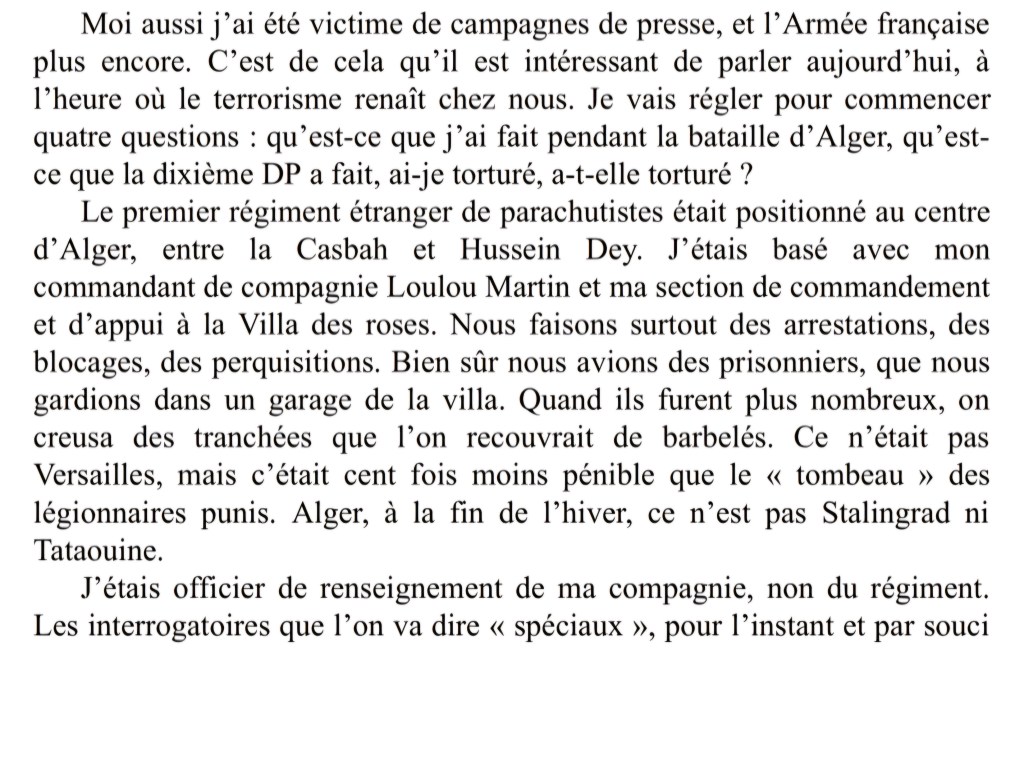 Ces phrases, je les ai prononcées. Je ne les renie pas, mais je les explique, j’ai commencé à le faire dans un courrier envoyé à Combat le jour même de leur parution. Un, j’ai donné au mot torture le sens limité que j’ai défini plus haut, et deux, le nous désigne l’armée française dont je suis solidaire, non pas moi et mes camarades, qui n’étions nullement chargés, je le répète, des interrogatoires spéciaux. J’ajoute ici que nous avons agi, nous les paras, nous les légionnaires, nous les soldats français, en conformité avec la directive spirituelle que nous avions reçue de notre aumônier, le père Delarue. Nous, nous avons respecté les lois de la guerre, ce qui n’était pas le cas de nos ennemis. 》