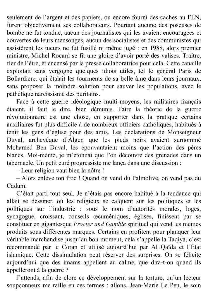 Et je pense honnêtement qu’il y a une confusion chez beaucoup de personnes, dans le sens où, lorsque Le Pen dit que la torture existait, reconnaître son existence ne signifie pas forcément y avoir participé. Et lorsqu’il dit qu’elle était nécessaire dans certains cas, reconnaître sa nécessité ne veut pas dire y participer.
