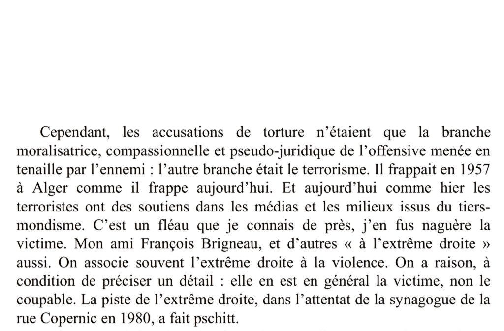 Les journalistes d’investigation Pierre Péan et Philippe Cohen (qui sont plutôt issus de la gauche historique et qui, crois-moi, n’auraient pas hésité à taper sur Le Pen à la moindre occasion) relatent dans le livre ‘Le Pen, une histoire française’ que « s’il a sans doute brutalisé des Algériens », Le Pen n’a « pas pratiqué la torture institutionnelle ».